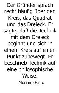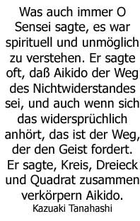 | Aikido und seine philosophischen Grundlagen Aus dem Buch "Erinnerungen an O Sensei", mit freundlicher Genehmigung des Joy Verlag. Das Geheimnis von Aikido besteht nicht darin, wie ihr eure Füße bewegt, sondern, wie ihr euren Geist bewegt. Ich unterrichte keine Kampftechnik. Ich unterrichte Gewaltlosigkeit.